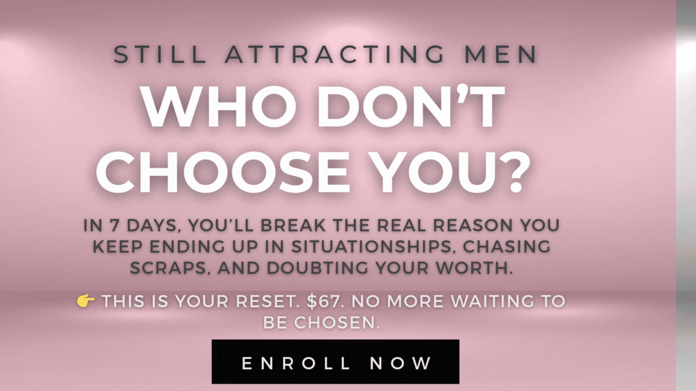 In just 7 days, you’ll stop chasing what doesn’t feel safe, stop settling for “almost,” and start becoming the version of you that gets love without begging for it.
