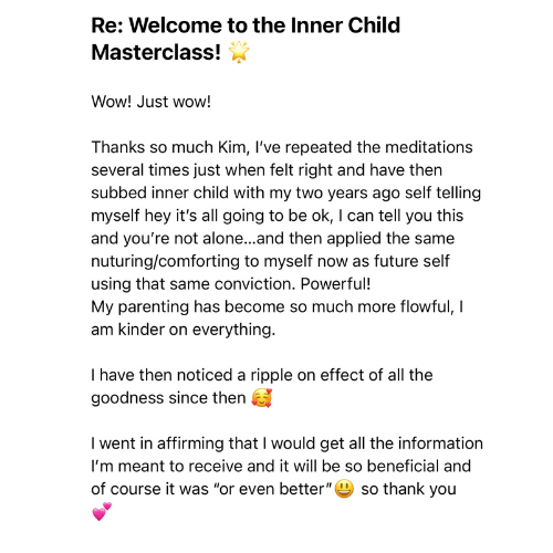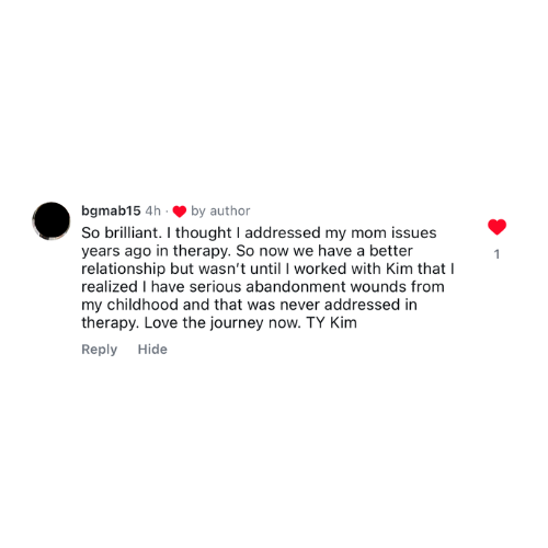 “I’ve done therapy for years, but nothing ever felt like it clicked until I went through this course. Kim, you’re a genius. I’ve released so much pain I didn’t even realize I was carrying, and I finally feel safe with myself.” – Sarah
