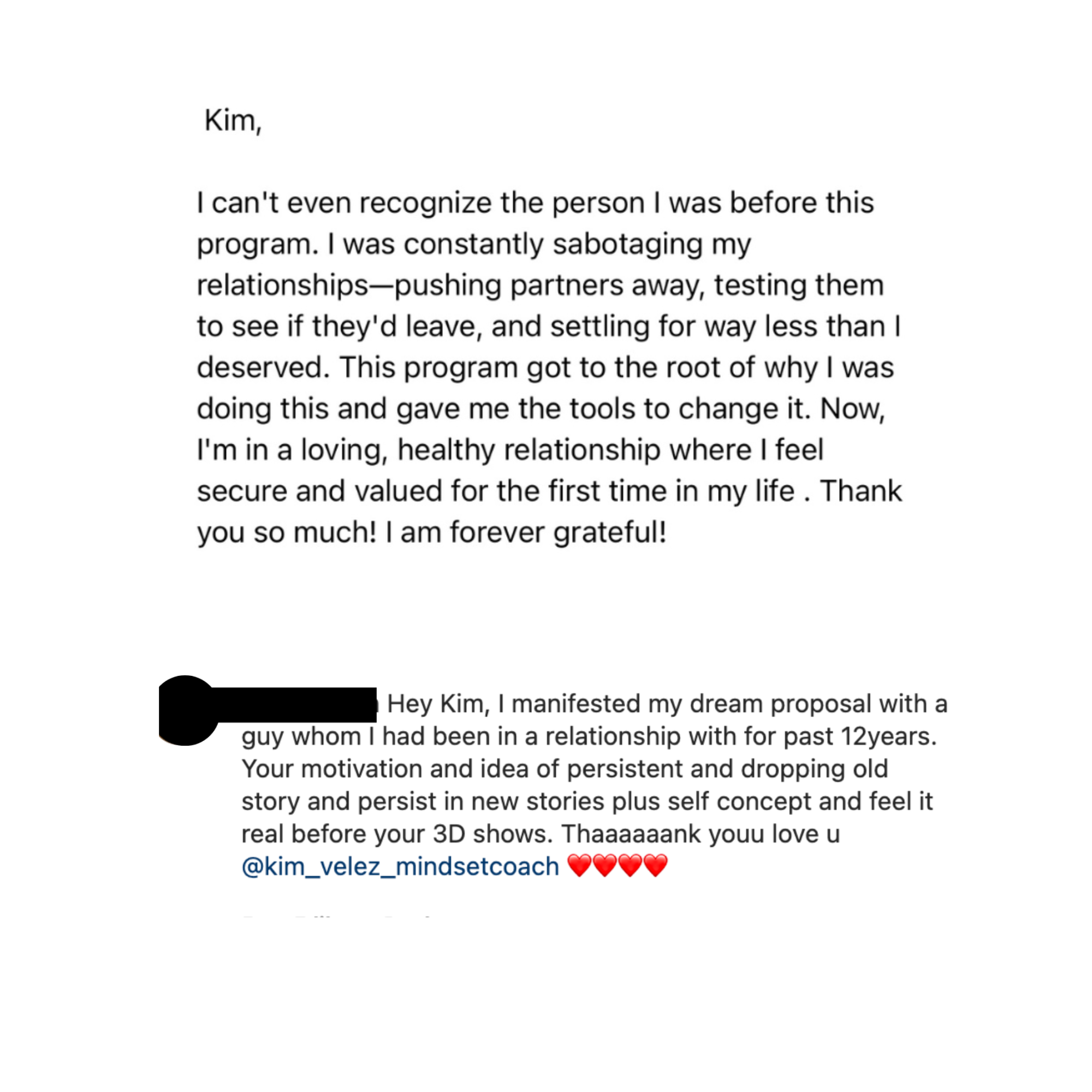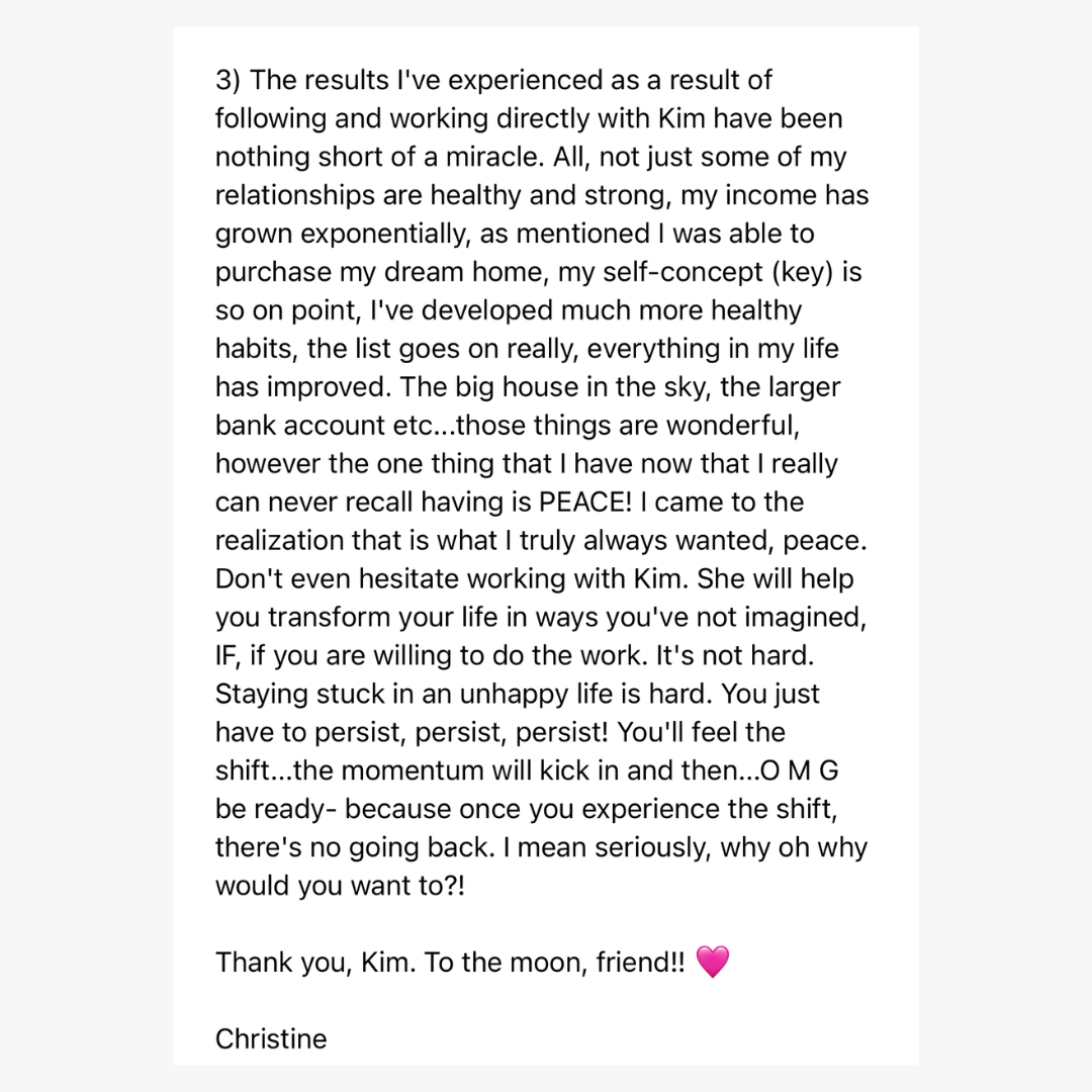 Outcome Disclaimer: While I am committed to providing you with the highest quality coaching and support to facilitate your transformation, I cannot guarantee or promise specific outcomes or that you will manifest everything you desire within the timeframe of our work together. Transformation is a deeply personal process, and the results can vary significantly between individuals. Your success depends on your personal efforts, individual capacity, life circumstances, and the commitment to applying the strategies taught. As your coach, I will guide, support, and assist you in your journey, but the internal work required to reprogram and transform your mindset ultimately rests within your control.